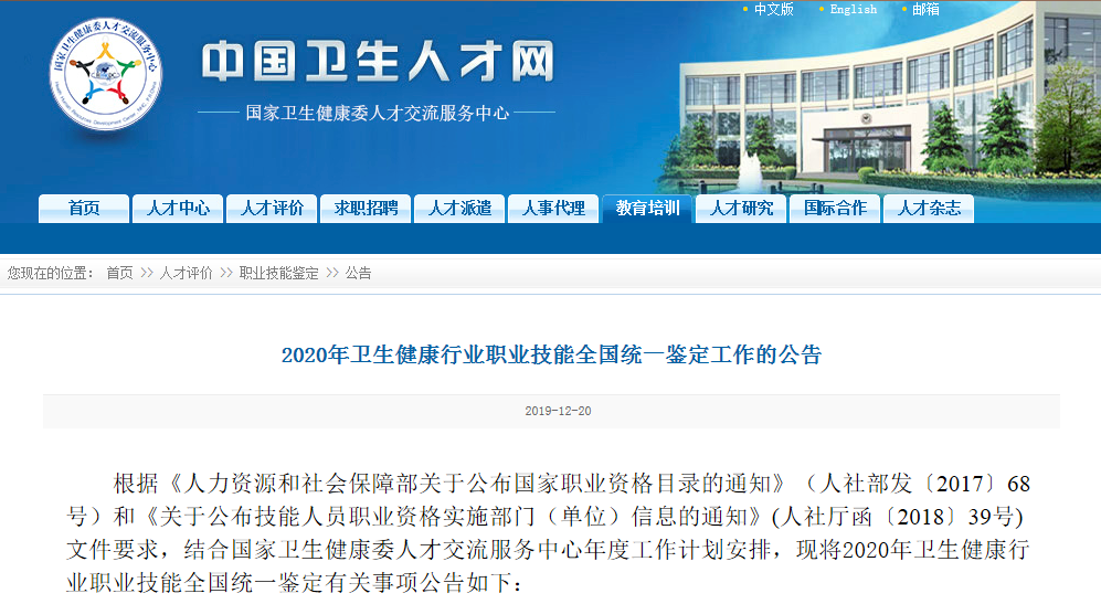 昨日,国家卫健委发布《2020年卫生健康行业职业技能全国统一鉴定工作的公告》。