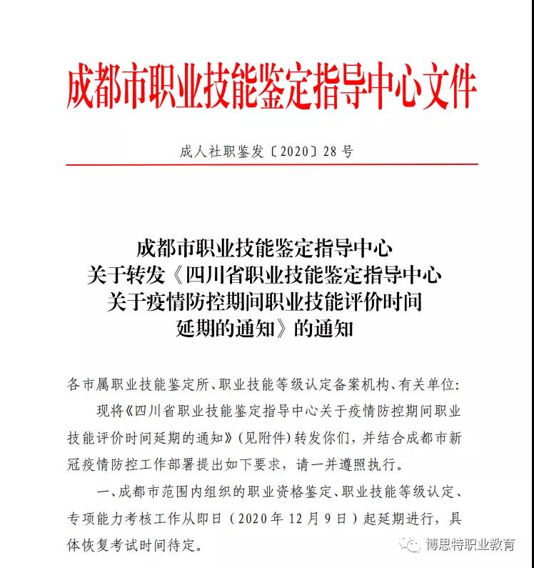为深入贯彻落实新冠肺炎疫情防控有关要求,减少人员大面积聚集,全力确保每一位考生安全健康,根据当前成都市疫情防控形势,经研究,成都市范围内组织的职业资格鉴定、职业技能等级认定、专项能力考核工作从即日(2020年12月9日)起延期进行,具体恢复考试时间待定。