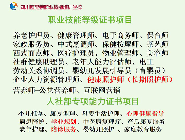 养老护理员、健康管理师、电子商务师、互联网营销师、