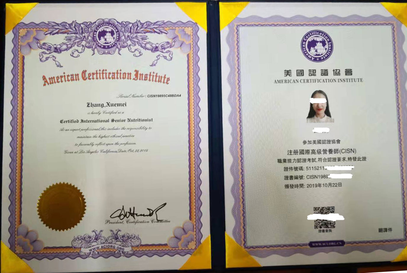 注册国际营养师:是由美国认证者协会颁发的ACI证书。